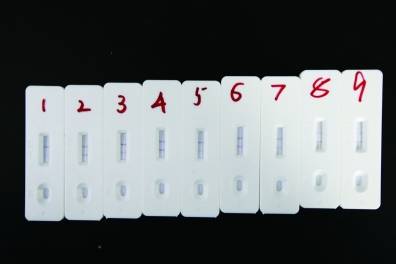 將檢測卡平放,用移液器或滴管吸取待檢樣品溶液,加入3滴于加樣孔中,加樣后開始計時;在5~8分鐘讀取結果。陽性:位置C顯示出條帶,位置T無條帶,表明樣品中黃曲霉毒素B1濃度高于限量。